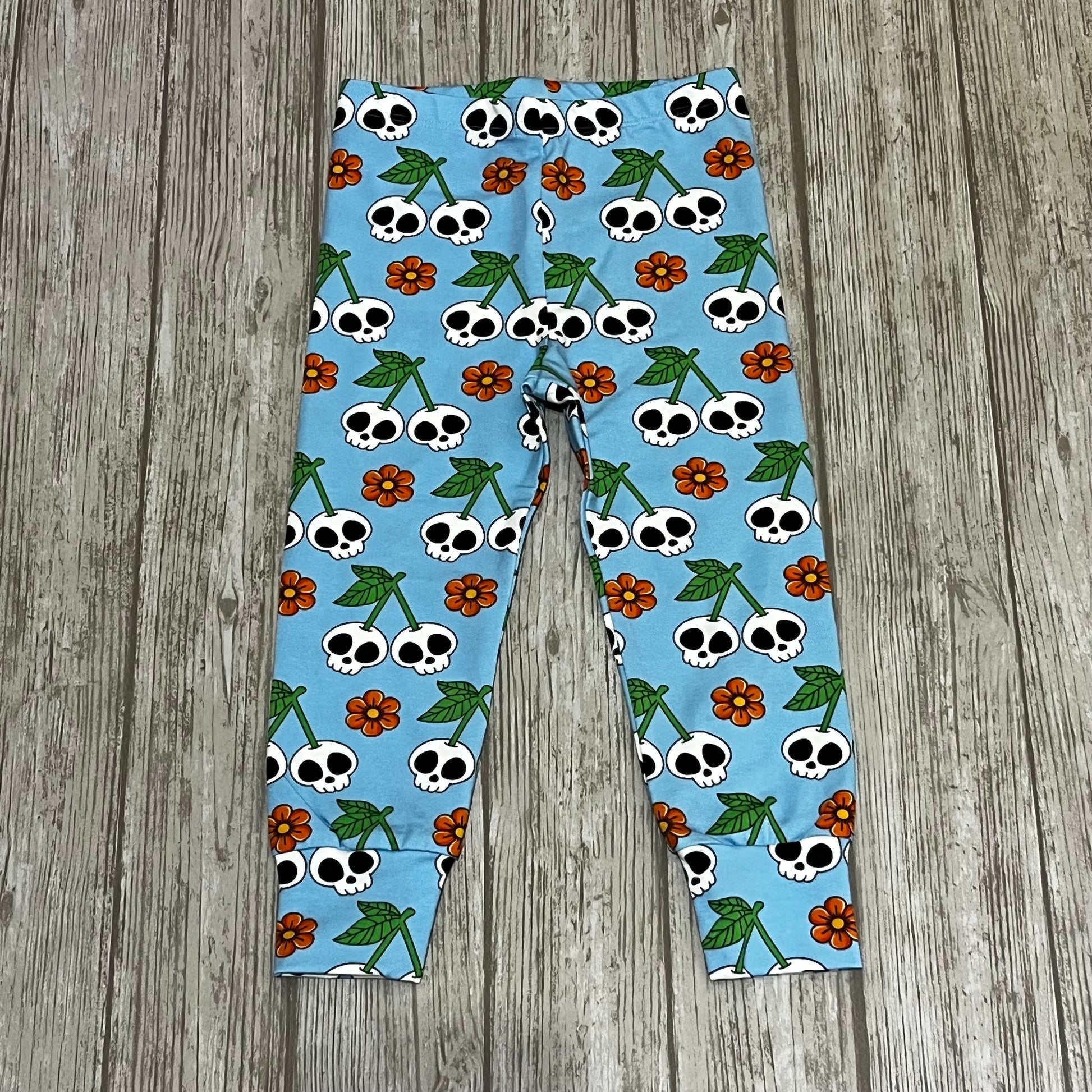 Byxorna är tillverkade av mjukt jersey. Det ger en följsam känsla mot huden samtidigt som tyget håller formen tvätt efter tvätt. Resåren i midjan gör att byxorna sitter bekvämt utan att skära in, och mudden nedtill gör att de sitter på plats oavsett om barnet kryper, springer eller klättrar.