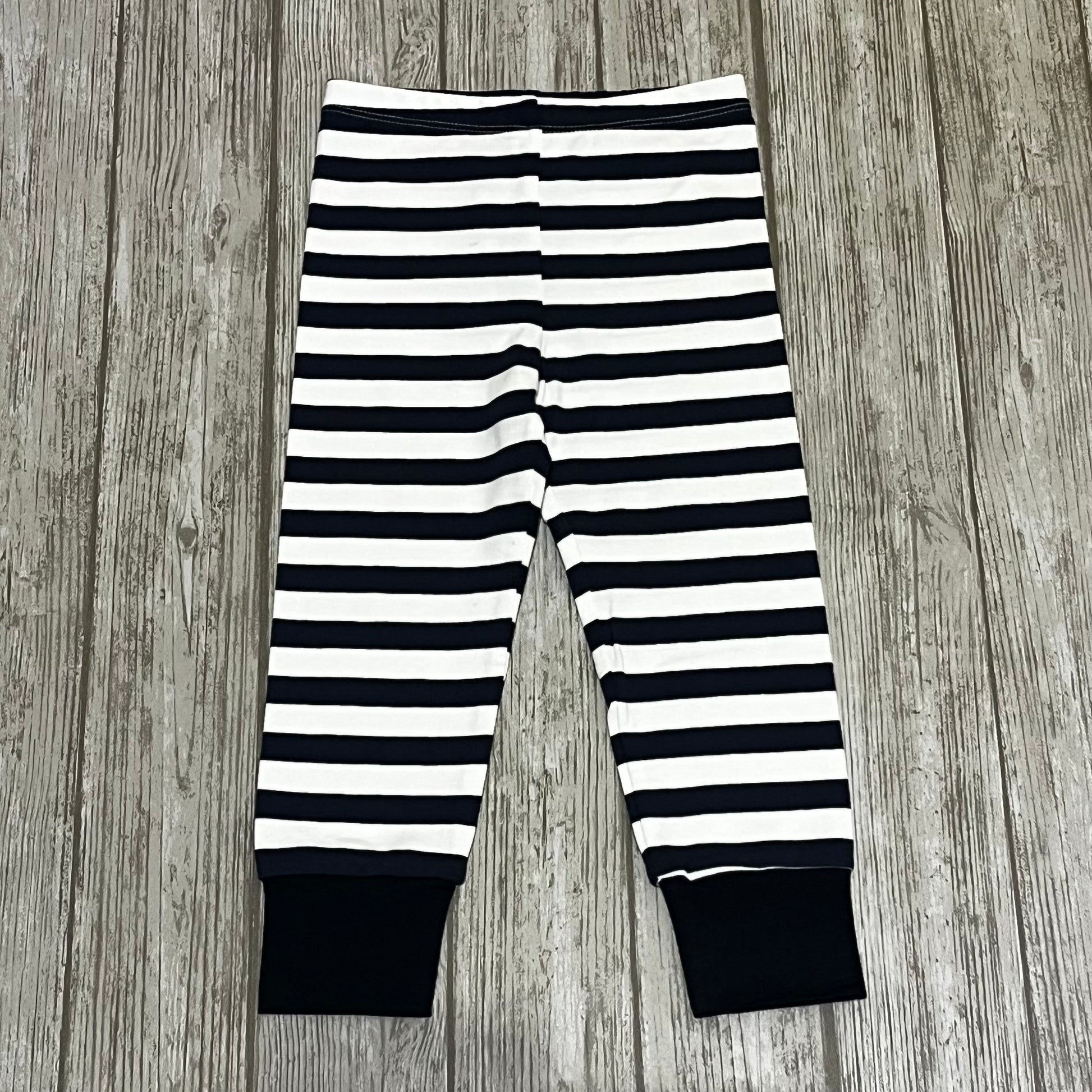 Byxorna är tillverkade av mjukt jersey. Det ger en följsam känsla mot huden samtidigt som tyget håller formen tvätt efter tvätt. Resåren i midjan gör att byxorna sitter bekvämt utan att skära in, och mudden nedtill gör att de sitter på plats oavsett om barnet kryper, springer eller klättrar.