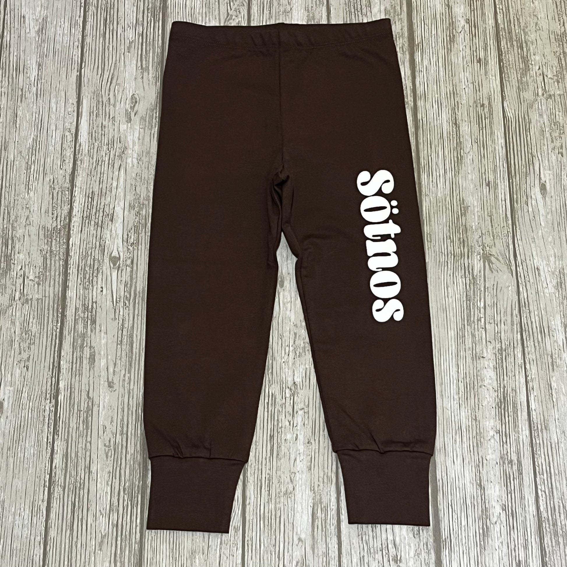 Byxorna är tillverkade av mjukt jersey. Det ger en följsam känsla mot huden samtidigt som tyget håller formen tvätt efter tvätt. Resåren i midjan gör att byxorna sitter bekvämt utan att skära in, och mudden nedtill gör att de sitter på plats oavsett om barnet kryper, springer eller klättrar.